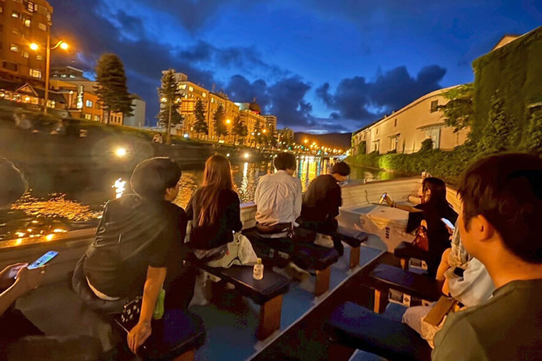 夜は小樽運河のナイトクルーズで、歴史ある街並みと夜景に感動するシーンも。